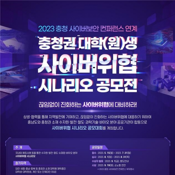시나리오는 7월 31일까지 접수를 받고 있으며, 공모전 결과는 8월 심사를 거쳐 최우수상 1팀(상금 500만원) 및 국가철도공단 이사장상 등 우수상 6팀(상금 각 300만원)을 선정하여 9월 19일 개최되는 ‘2023 충청 사이버보안 컨퍼런스’에서 시상을 진행할 예정이다.