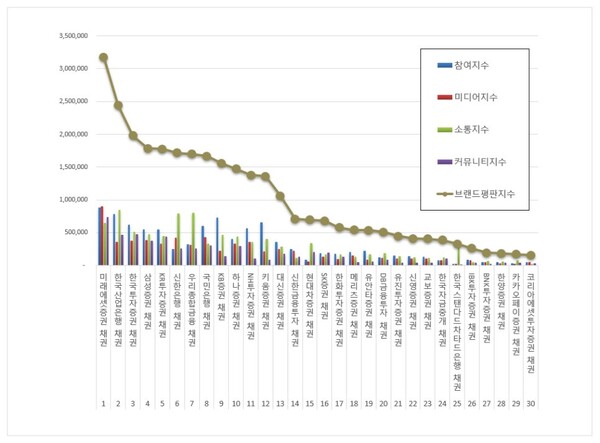 2025년 10월 채권 브랜드평판 30위 순위는 미래에셋증권, 한국산업은행, 한국투자증권, 삼성증권, KR투자증권, 신한은행, 우리종합금융, 국민은행, KB증권, 하나증권, NH투자증권, 키움증권, 대신증권, 신한금융투자, 현대차증권, SK증권, 한화투자증권, 메리츠증권, 유안타증권, DB금융투자, 유진투자증권, 신영증권, 교보증권, 한국자금중개, 한국스탠다드차타드은행, IBK투자증권, BNK투자증권, 한양증권, 카카오페이증권, 코리아에셋투자증권 채권 순으로 나타났다.