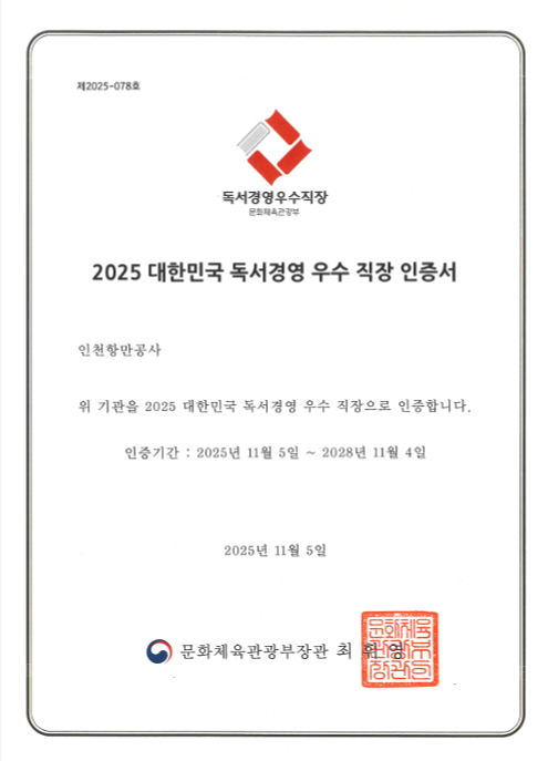 인천항만공사(IPA)는 문화체육관광부로부터 ‘2025 대한민국 독서경영 우수 직장’으로 재인증되었다고 26일 밝혔다.